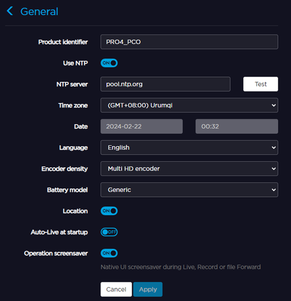 > General > Date. (Optional) Enable the Use NTP toggle and enter an NTP Server address in the field below.