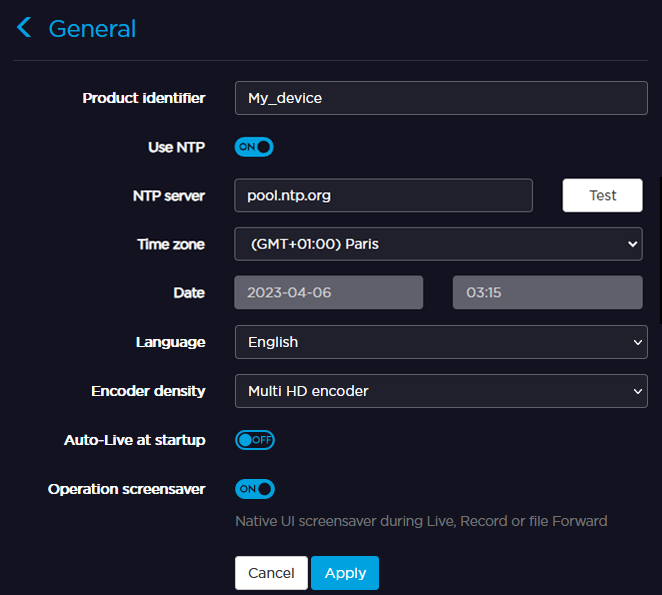 > General > Date. (Optional) Enable the Use NTP toggle and enter an NTP Server address in the field below.