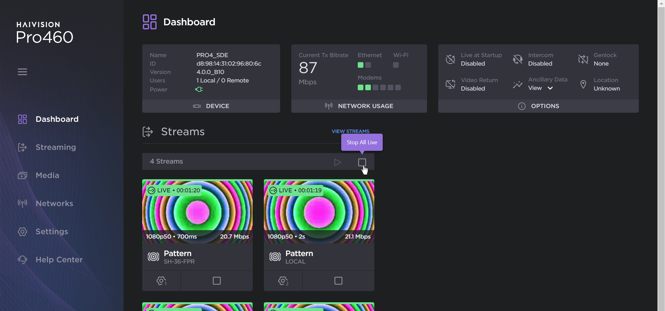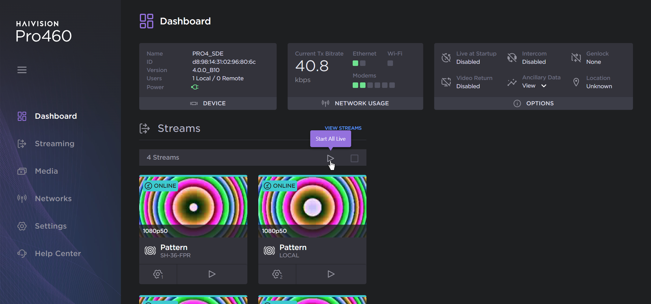 You can start a live manually via the unit panel, web interface, or camera or you can enable the Auto-live at startup. See Enabling/Disabling Auto-Live at Startup.