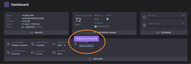 When the option is enabled, you can check the location information of the device either from the Unit Panel or from the Web Interface.
