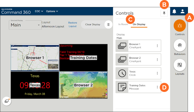 When viewing the entire activity interface, the Controls panel lists the assets available in the room and currently on the display.