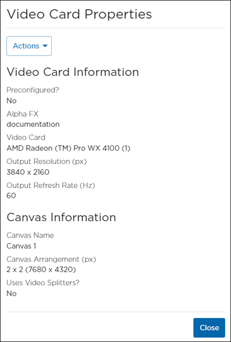 Clicking the name of a video card on the Alpha FX page opens the Properties panel for that card: