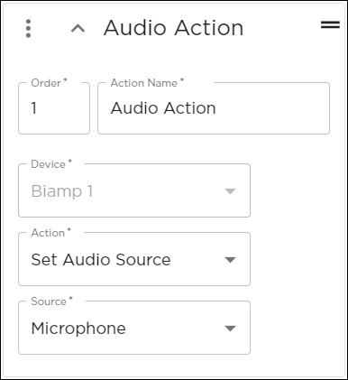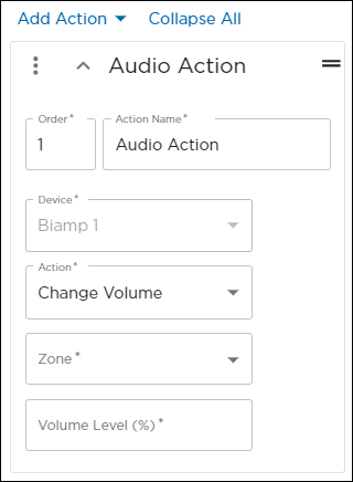 Audio actions allow you to change volume, set an audio source, and mute or unmute mics and outputs in a given zone.