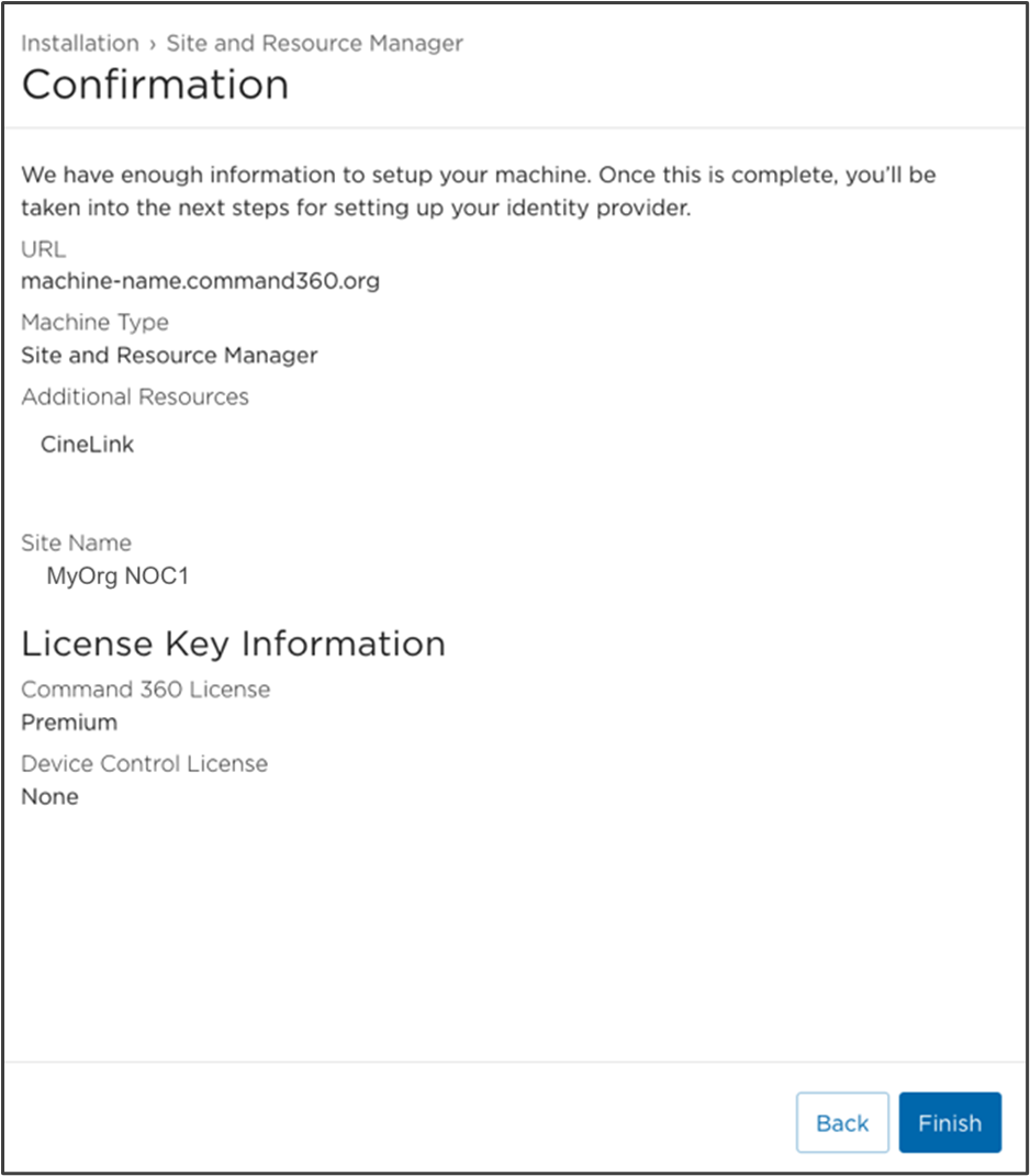 A Confirmation page appears providing the Machine URL, Machine type, Resources, Site Name, and License Key information.
