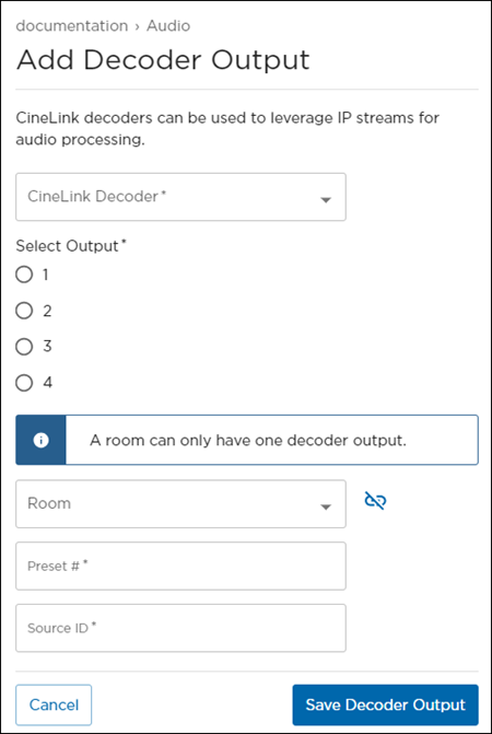 (Optional) To configure a connected CineLink decoder to decode IP stream audio, click the Decoder Outputs tab.