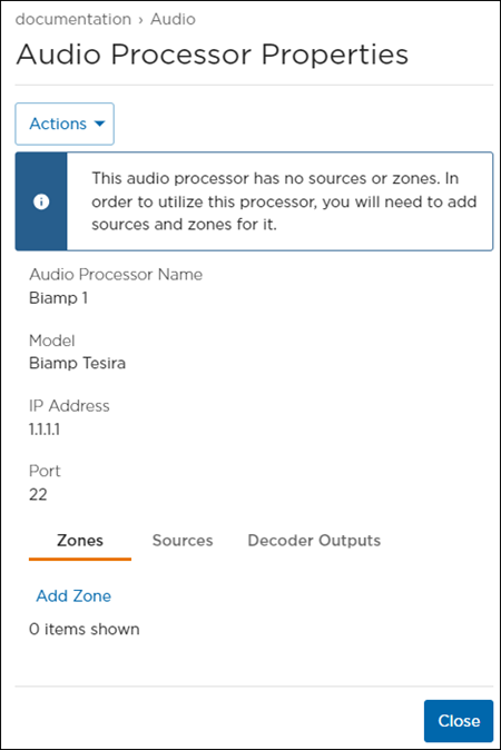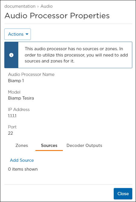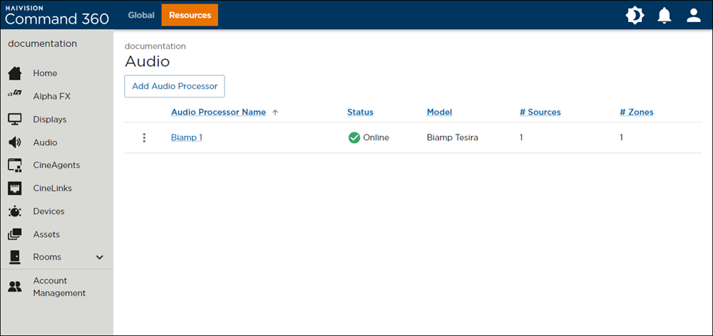 A newly added audio processor requires assignment of zones and sources. To configure these, return to the Audio option in the Resources admin management page.