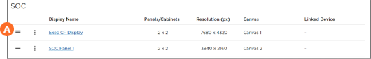 Display List: Summary of displays and associated panels/cabinets arrangement, canvas, and linked device. Click a display name to open the Display Properties panel.