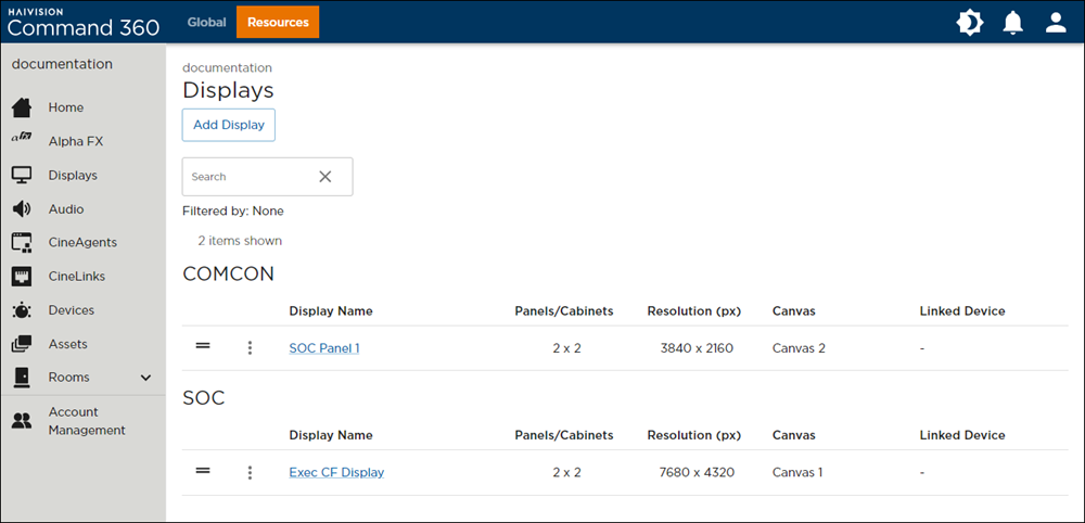 Displays are the virtual representation of the physical panels on which video wall content appears. Add, view, and manage displays from the Displays interface of the Resource Admin Management page.