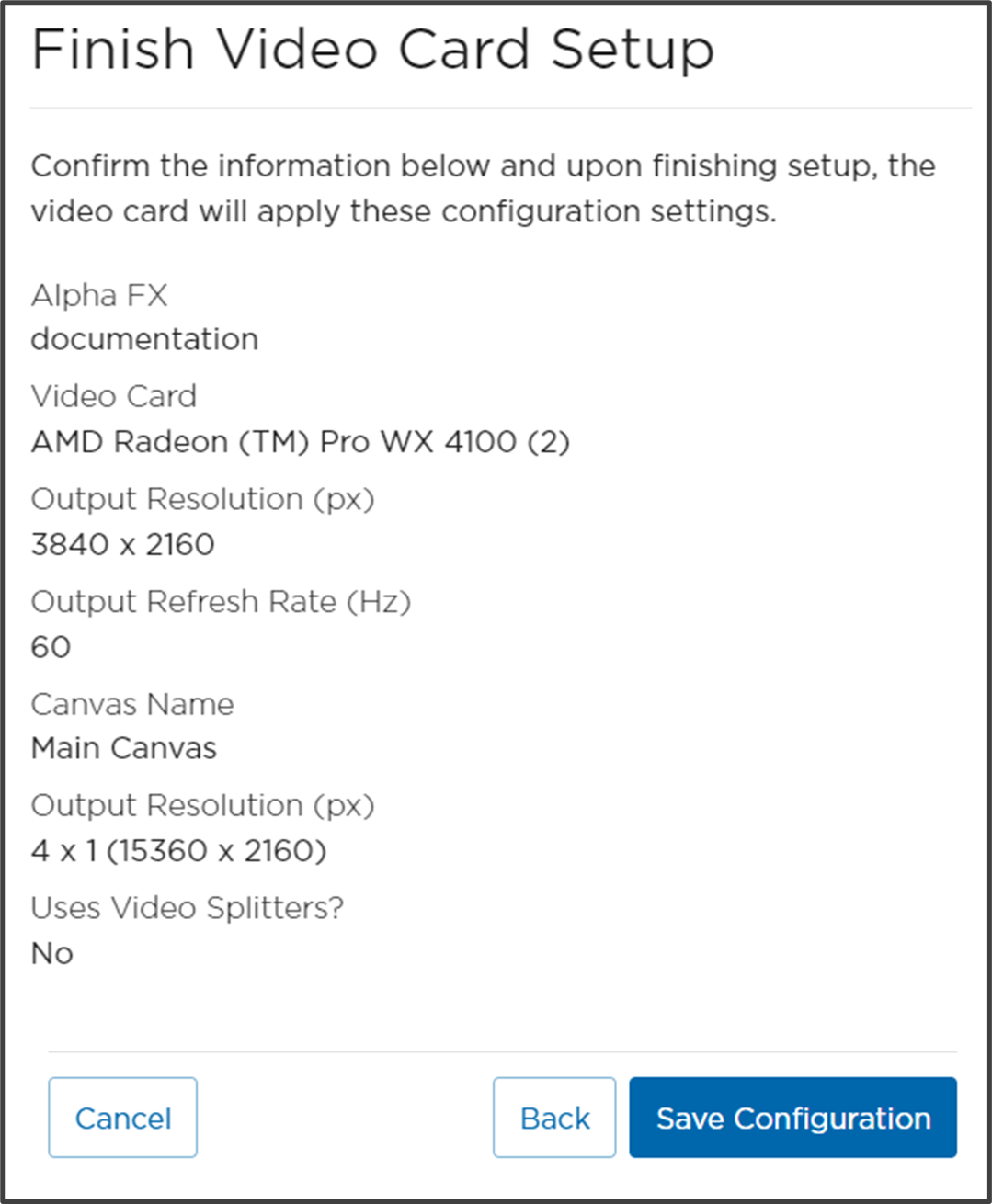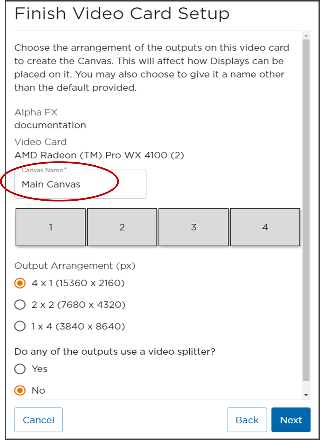 The Canvas was established during video card set up. The number of canvases available corresponds to the number of video cards configured. If during setup the user indicates the video card has no splitter, then the rows and columns designation below assumes each panel has 4k resolution. If the video card does have a splitter, additional options appear for panel resolution.