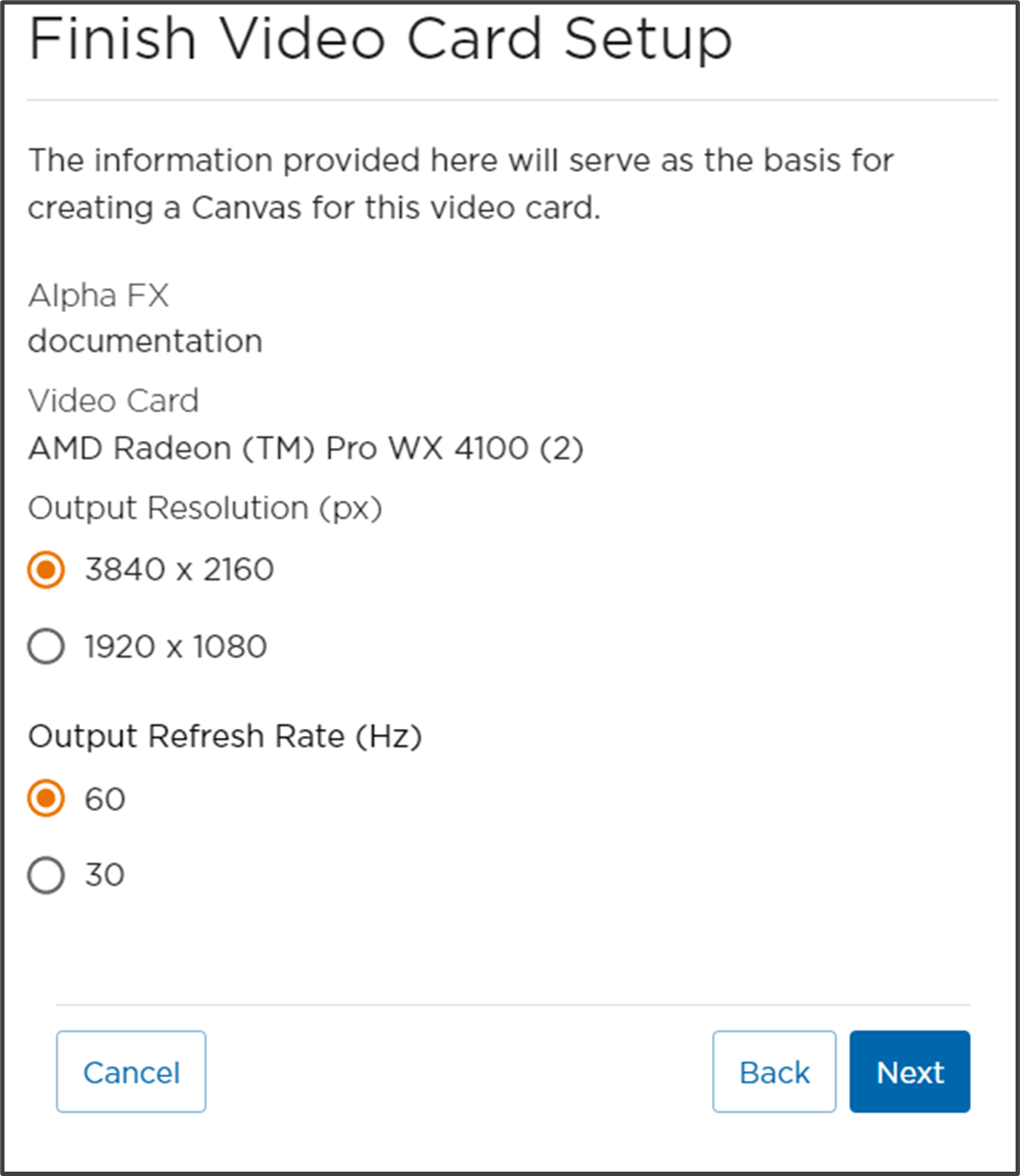 If the video card is preconfigured, please ensure that your selections in this workflow match your card's configuration. An incorrect selection here is not revertible within the user interface.