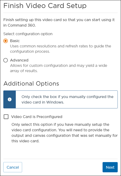 Choose either a Basic or Advanced configuration option. If the card was preconfigured in Windows, click the checkbox next to Video Card is Preconfigured.