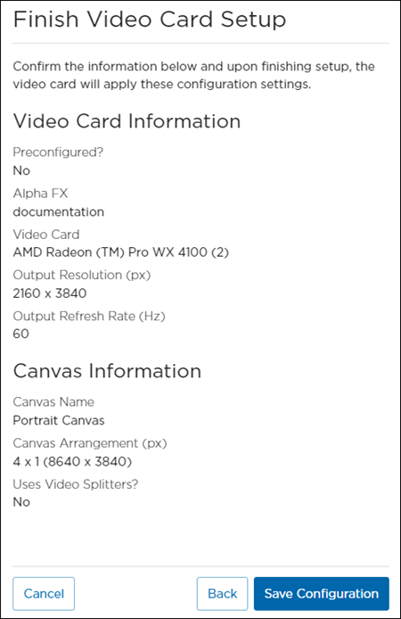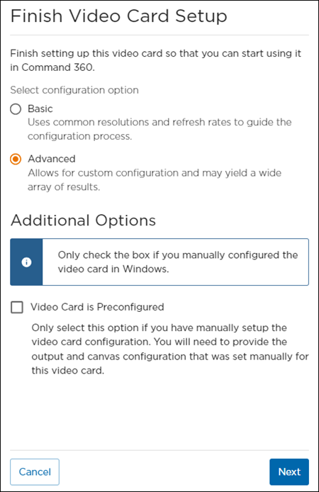 If the video card is preconfigured, please ensure that your selections in this workflow match your card's configuration. An erroneous selection here is not revertible within the user interface.