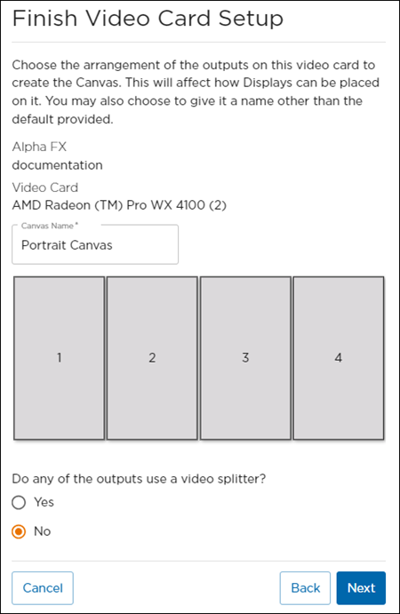 Select the appropriate response to designate whether any of the outputs use a video splitter. For the above example, the response is No. Click Next.