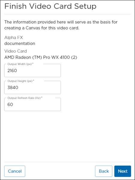Populate the Output Width, Output Height, and Output Refresh Rate, then click Next.