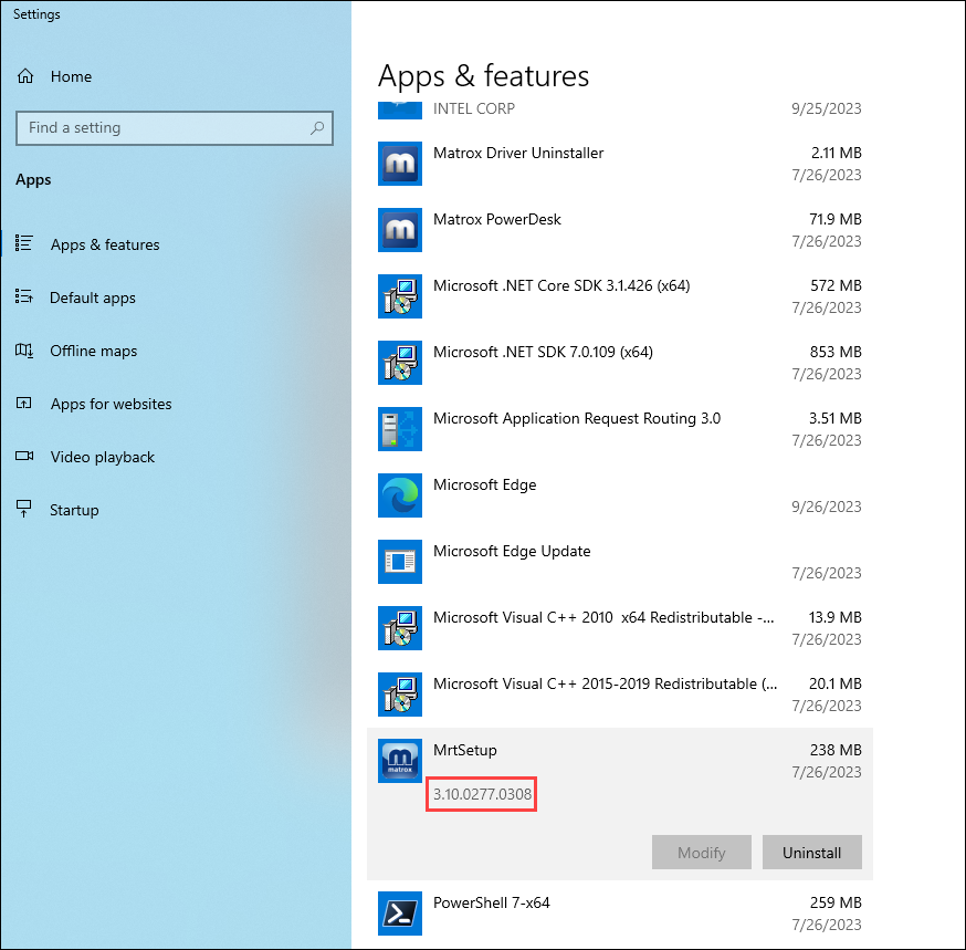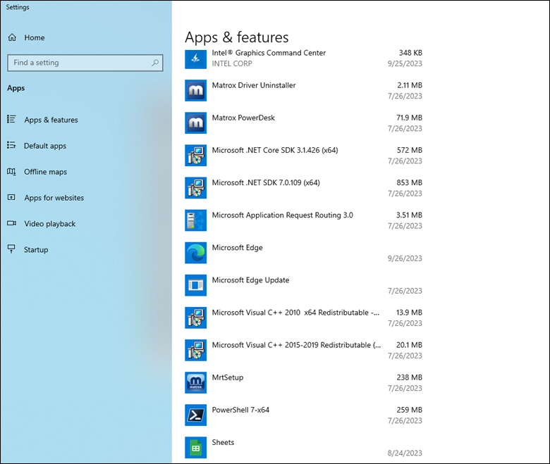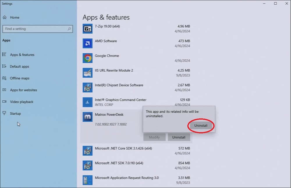 - Still in Apps & Features, locate Matrox PowerDesk.