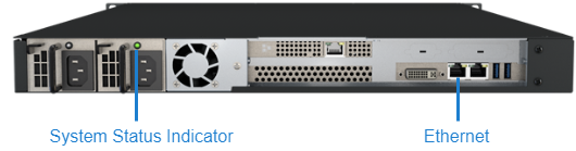 The image below shows the network ports and system status LED for the Command 360 Manager: