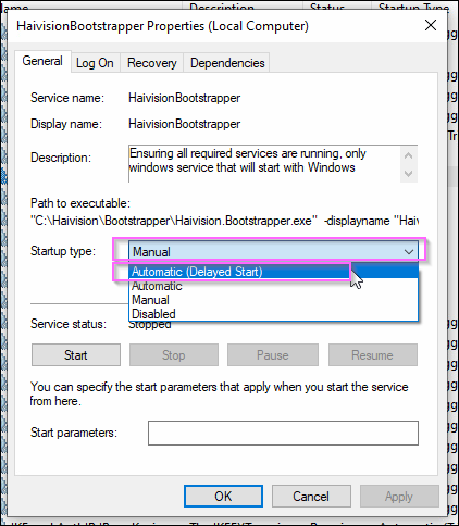 On the General tab, click the Startup type drop-down and select Automatic (Delayed Start).
