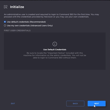 After Command 360 successfully initializes, details for accessing the system appear. Click Exit when finished.
