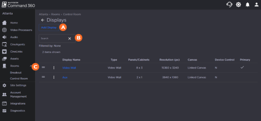 Displays are the virtual representation of the physical panels on which video wall content appears. Add, view, and manage displays from the Displays resource in the Room interface.