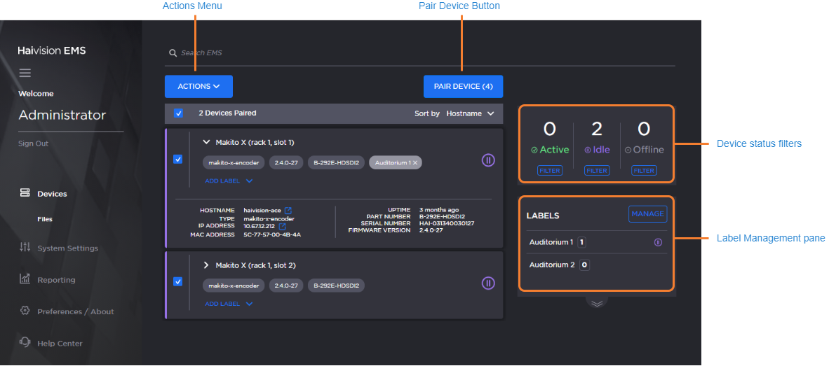 The Devices screen lists all devices currently paired with EMS. You can expand/collapse the device listings to see more information, including hostname, IP and MAC addresses, system uptime, and device serial numbers.