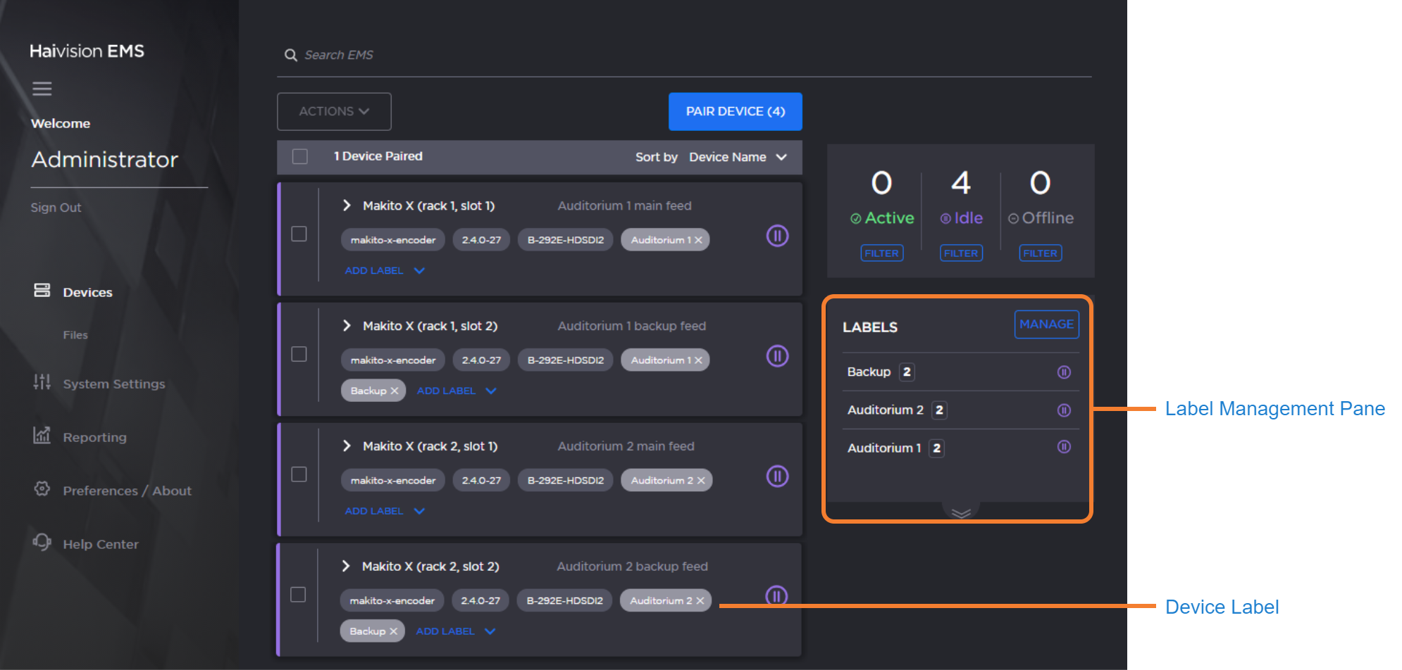 EMS has the ability to create, customize, and assign labels to paired devices to make organization easier.