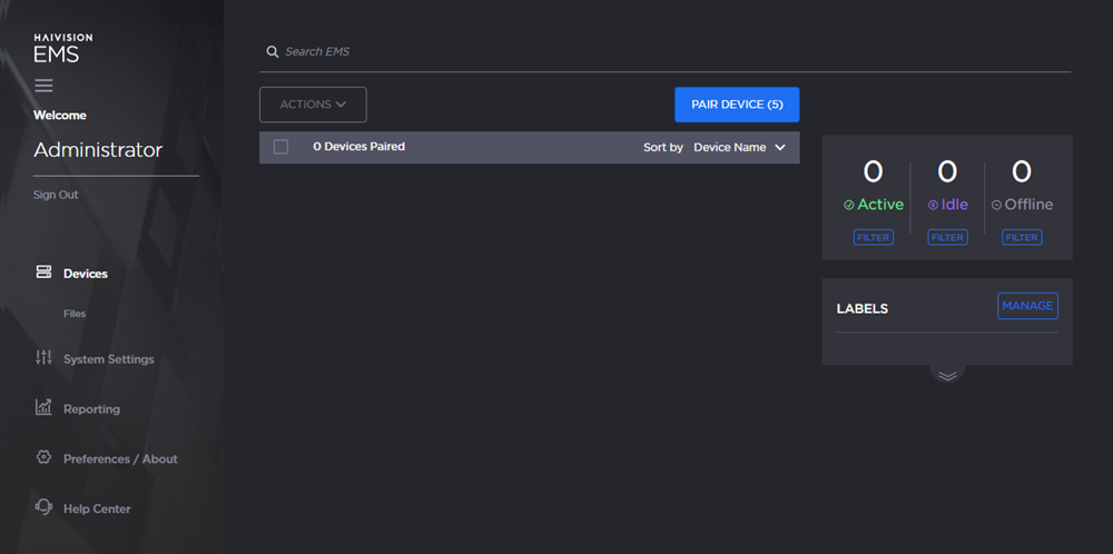When you first sign in, the EMS Web interface opens to the main Devices screen (as shown in the following example). From here, you can pair and manage devices.
