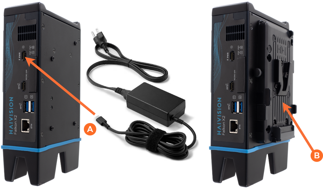Connect to the unit one of the following external power sources: the supplied AC/DC adapter (USB-PD 3.0 compliant and providing more than 65W), or an external V-Mount or Gold-Mount battery (not supplied) using the included DTAP-to-USB-C cable.