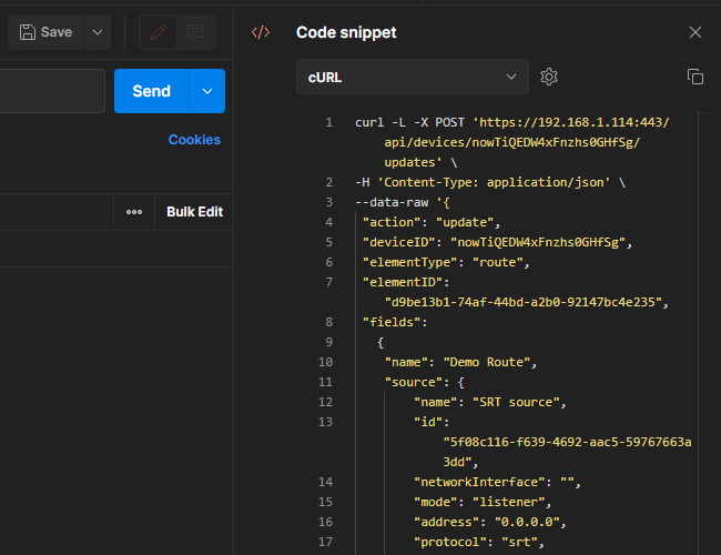 You can easily generate code snippets for other programming languages in Postman. After confirming your command is valid with a successful response, click the </> Code Snippet link to the right of the Send button.