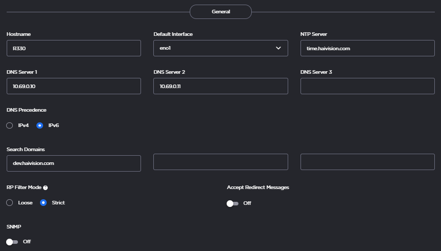 The available network configuration settings are listed in the view pane along with Interfaces and Static Routes.Fill in the General section as appropriate. See Network Settings for more information.