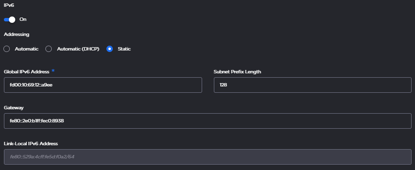 Under Interfaces, select whether the interface uses IPv4 and/or IPv6 protocols by toggling the On/Off switch next to each.