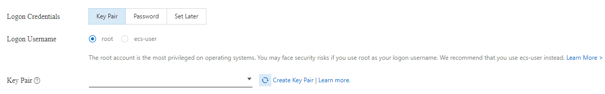 Ensure Key Pair and root are selected in Logon Credentials and Logon Username, and in Key Pair click Create Key Pair.