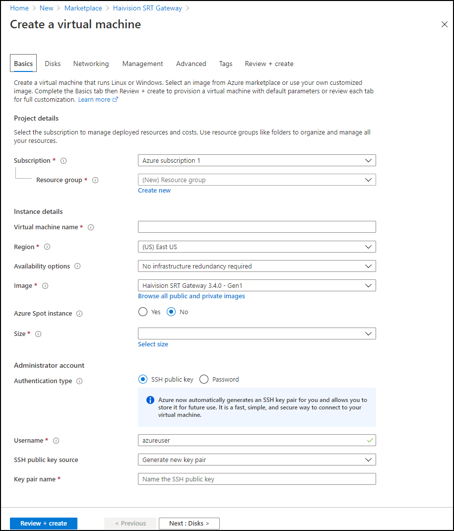 - Set up the administrator account by choosing SSH public key for the Authentication type and entering hvroot for the Username.
