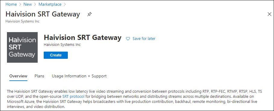 Multiple versions may be available in the Azure Marketplace. We recommend using the latest version, unless interoperating with Haivision Media Platform where the version is dependent on the HMP version.