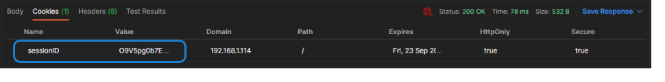 If successful, a session cookie is returned in the request. Click the Cookies tab to see the response.