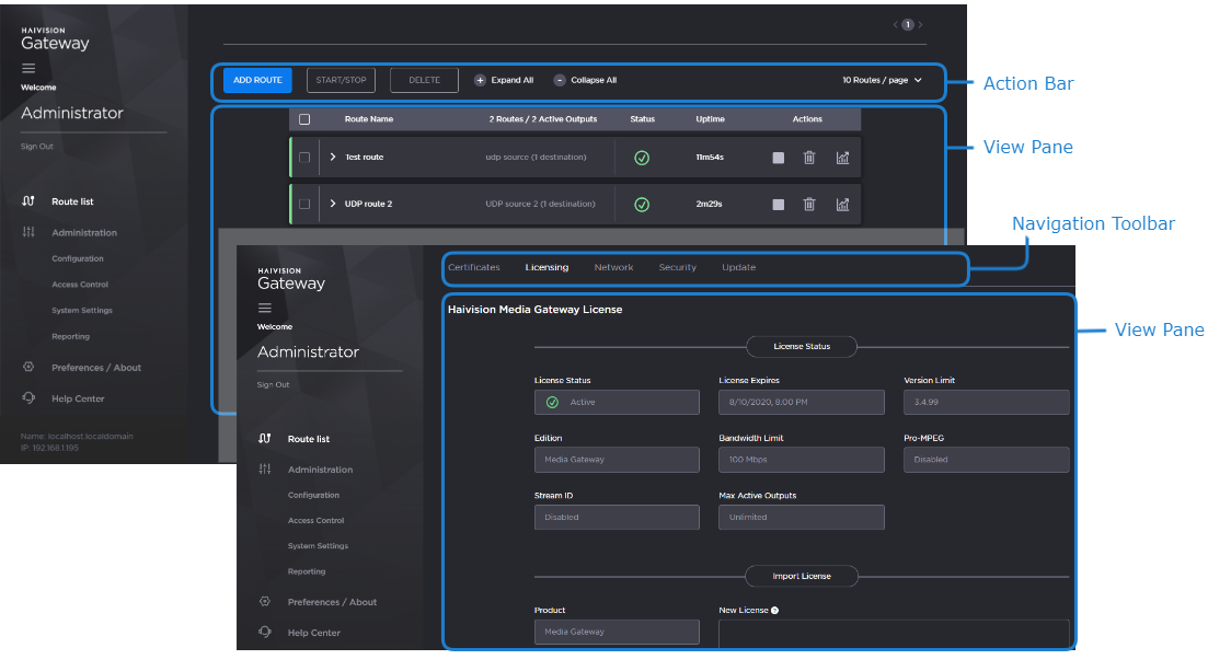 The view pane displays the appropriate items, fields, or status information for the currently selected screen.