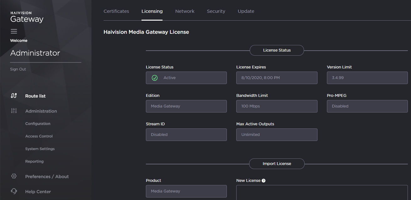 If logged in as an administrator, the Administration screens allows you to configure various options for your Haivision Media Gateway/SRT Gateway. The options on each of the four administration screens are grouped into categories listed in a toolbar at the top of the screen. The currently selected category is indicated as bold and underlined. The view pane displays the appropriate fields or items for your chosen category. Likewise, selections made in the view pane may also alter the available fields or options in the view pane. For example:
