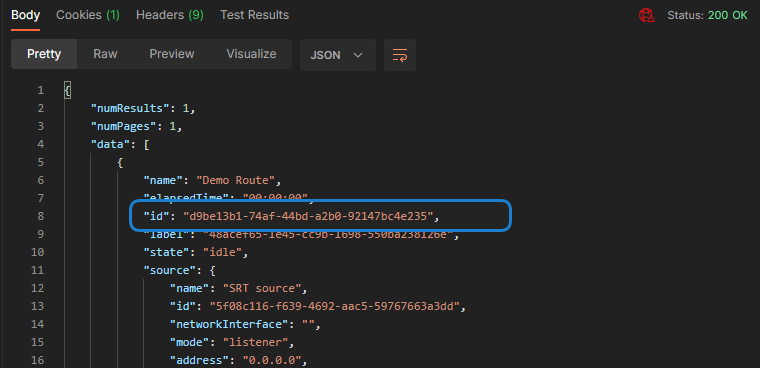 Results of the command are shown at the bottom of the request. Make note of any of the route, source, and destination ID values for future use.