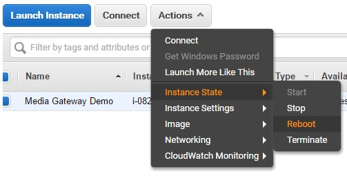 - After the Instance State changes to "running", reboot the virtual server by selecting it in the AWS View Instances page and clicking Actions > Instance State > Reboot.