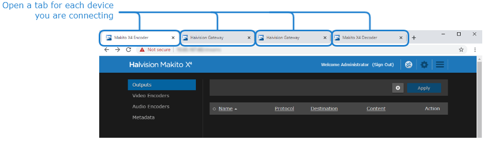 Use the tabs in one browser to point to the URL of each workflow element to create a workspace. For example, access the Makito X4 web interface of your source on one tab, the cloud Media Gateway/SRT Gateway on another, and so forth. This way, you can switch back and forth between them.