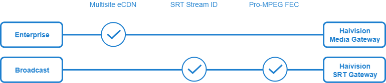 As of the version 3.2 release, Haivision Media Gateway is available for broadcast workflows as Haivision SRT Gateway. Haivision SRT Gateway gives you access to expanded functionality with SRT (Stream ID) and RTP (Pro-MPEG FEC) streams, while Haivision Media Gateway is geared toward HMP enterprise workflows, as explained in the following diagram and sections.