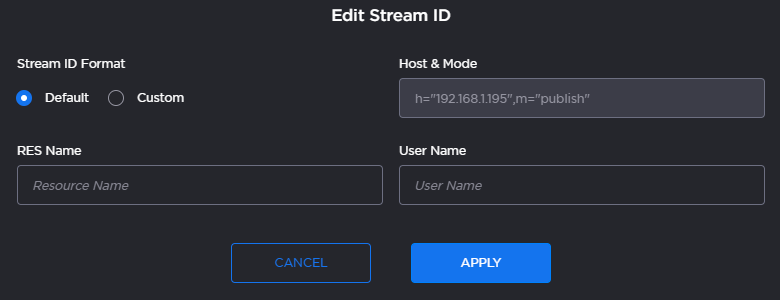 If Default Stream ID format is selected, enter the Resource Name and User Name. The resulting Stream ID appears below.