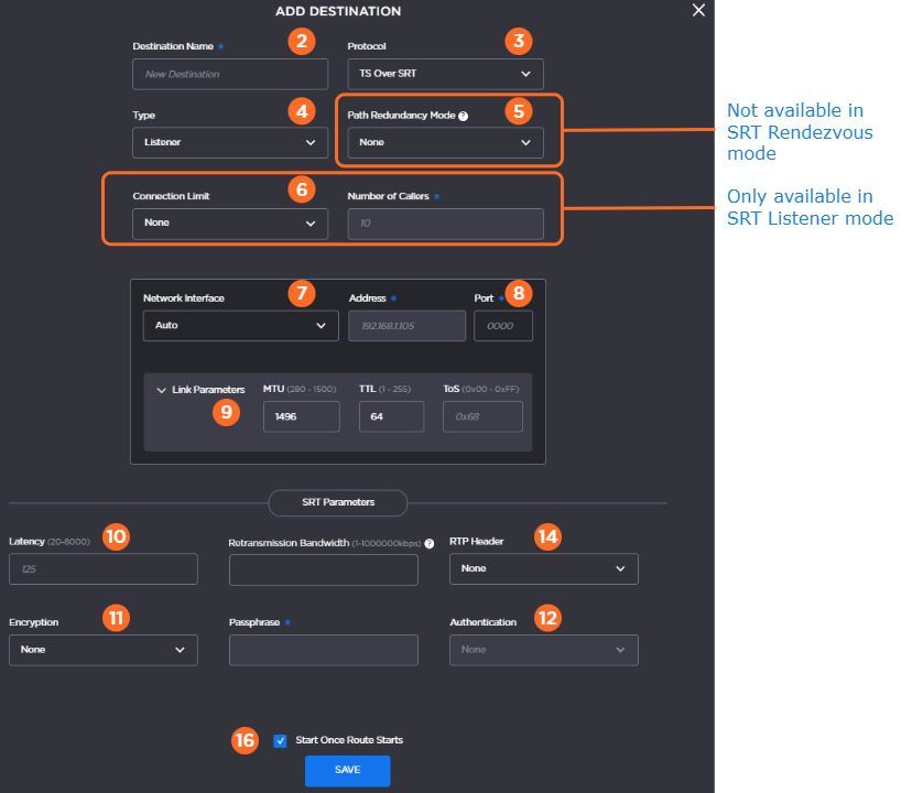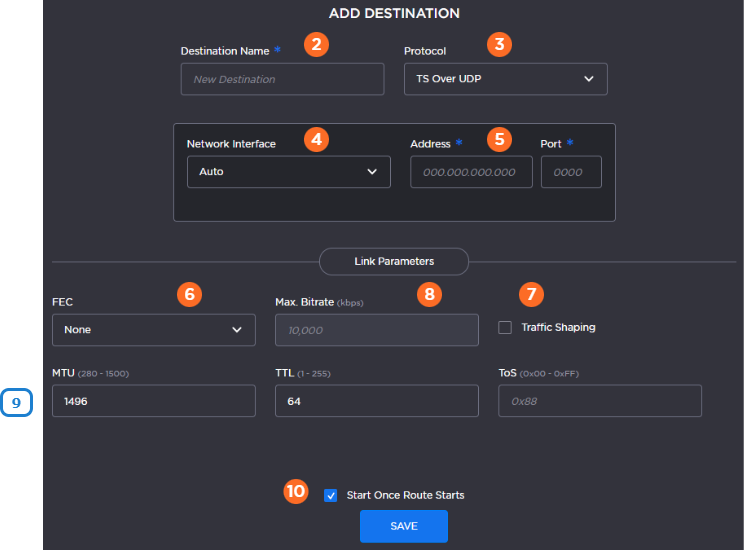 Optionally enabled/disable the destination to automatically start when the route is started, and click the Save button.