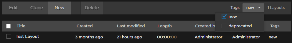 On the Layouts screen, you can then filter which layouts to view by selecting the appropriate tag in the Tags dropdown: