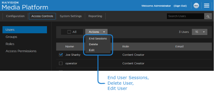 Haivision Media Platform allows you to display a list of users, add/delete them, change their passwords, assign roles to them, and end any of their current sessions. The available functionality of the Users list depends on the account usecase defined in the User Provisioning/SSO screen, as described in Managing User Provisioning/SSO.
