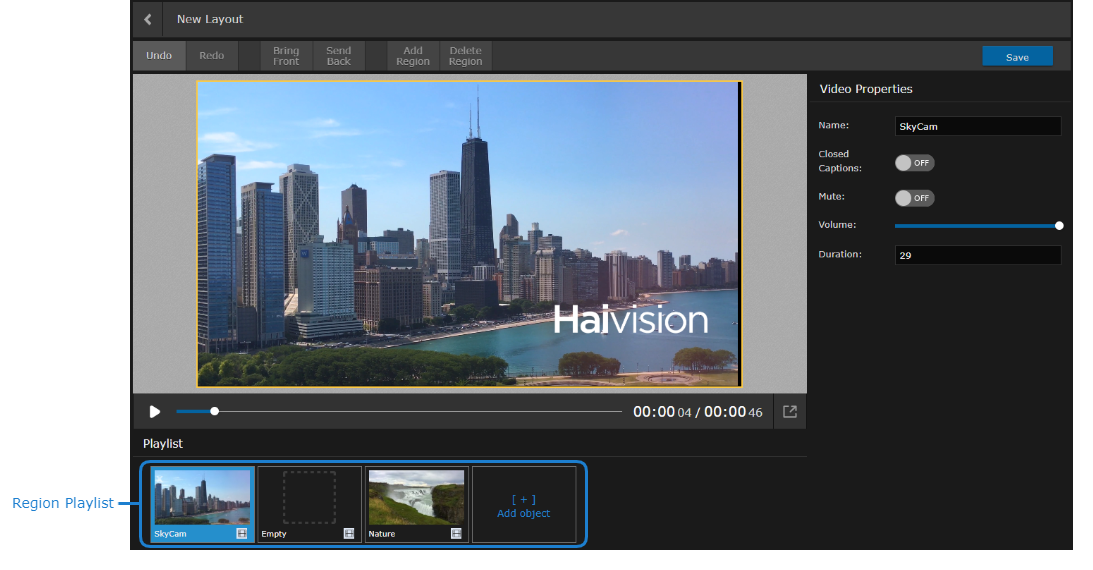 After an object is added to a region, clicking on it in the region or the region's playlist opens its object properties. See Videos, Sessions, and Sources Properties, Image Properties, and Widget Properties for details on the available object properties.