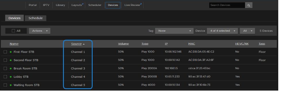 The Devices list displays summary information for each set-top box, including the status, name, source, current volume, device type, IP address, MAC address, HEVC/4K-support status, and assigned tags. Four colors indicate the device's connection status:
