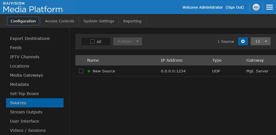 A source is an incoming unicast or multicast video stream or IPTV channel that can be recorded or viewed live. Haivision Media Platform provides access to video streams originating from Haivision Makito and Makito X encoders or other systems that produce compatible MPEG-TS video streams. When setting up HMP, you need to specify the streaming A/V sources to be available for content creators and others to view and capture.