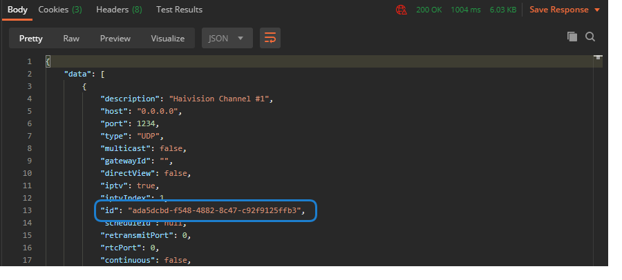 Results of the command are shown at the bottom of the request. Make note of the id value for future use.