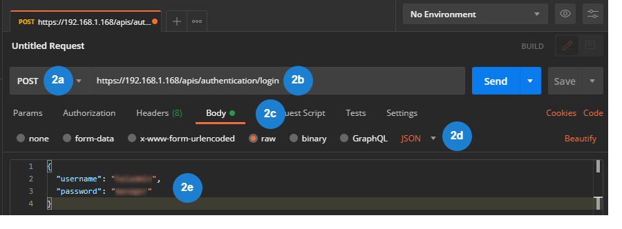 https://<HMP URL>/apis/authentication/loginSince the Login command requires you to supply the username and password, click the Body tab.