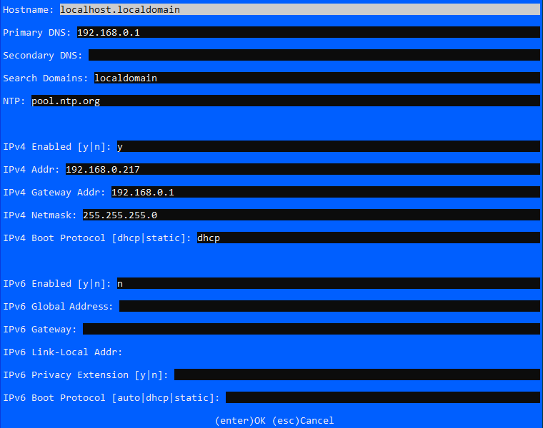 Using the ↓ (down arrow) to step through all the Network Settings, change the Hostname, IP Address, Gateway Address, Boot Protocol (DHCP or static), and any other settings as necessary.